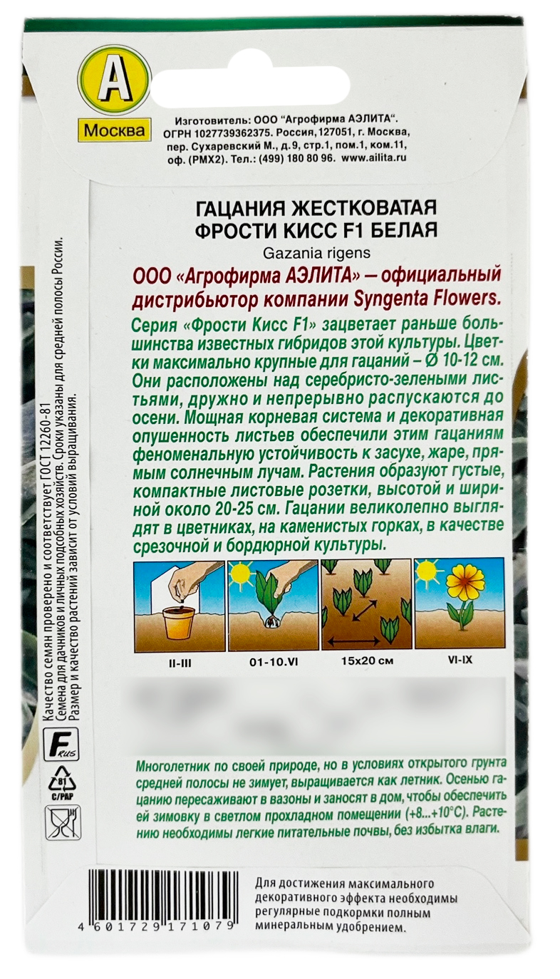 Гацания жестковатая ФРОСТИ КИСС F1 белая АЭЛИТАСерия «Фрости Кисс F1» зацветает раньше большинства известных гибридов этой культуры. Цветки максимально крупные для гацаний – диаметром 10-12 см. Они расположены над серебристо-зелеными листьями, дружно и непрерывно распускаются до осени. Мощная корневая система и декоративная опушенность листьев обеспечили этим гацаниям феноменальную устойчивость к засухе, жаре, прямым солнечным лучам. Растения образуют густые, компактные листовые розетки, высотой и шириной около 20-25 см. Гацании великолепно выглядят в цветниках, на каменистых горках, в качестве срезочной и бордюрной культуры.