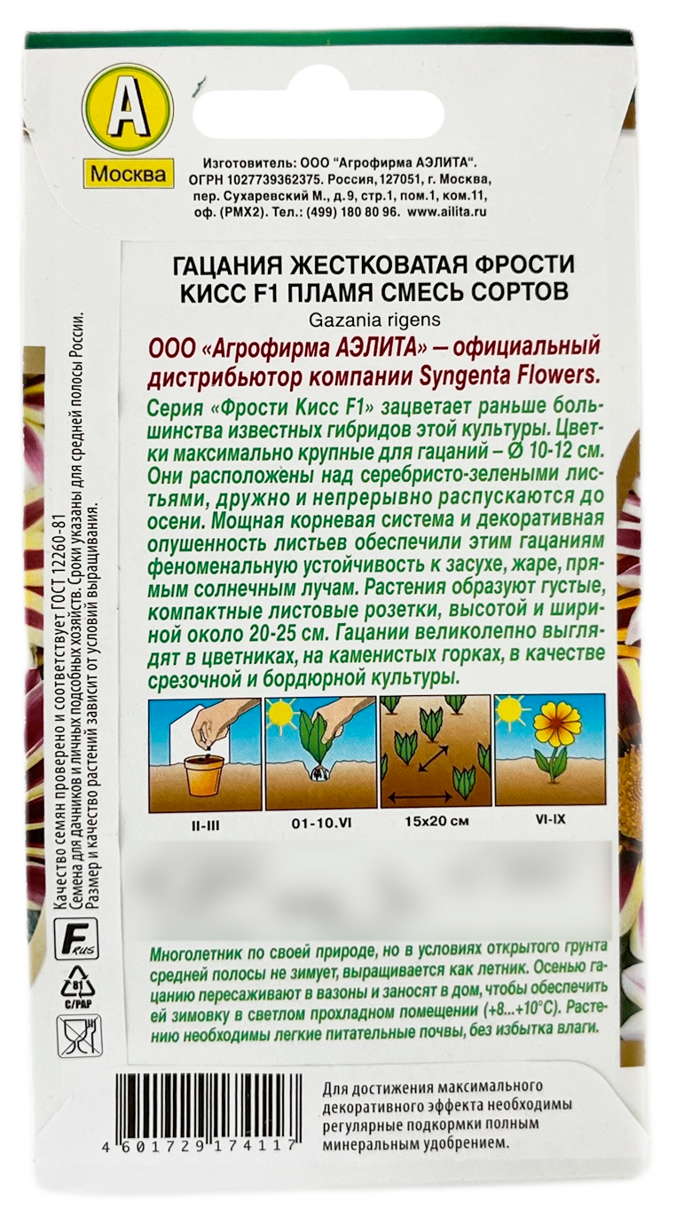 Гацания жестковатая ФРОСТИ КИСС F1 смесь сортов пламя АЭЛИТАСерия «Фрости Кисс F1» зацветает раньше большинства известных гибридов этой культуры. Цветки максимально крупные для гацаний – диаметром 10-12 см. Они расположены над серебристо-зелеными листьями, дружно и непрерывно распускаются до осени. Мощная корневая система и декоративная опушенность листьев обеспечили этим гибридам феноменальную устойчивость к засухе, жаре, прямым солнечным лучам. Растения образуют густые и компактные листовые розетки высотой и шириной около 20-25 см. Серия великолепно выглядит в цветниках, на каменистых горках, в качестве срезочной и бордюрной культуры.
