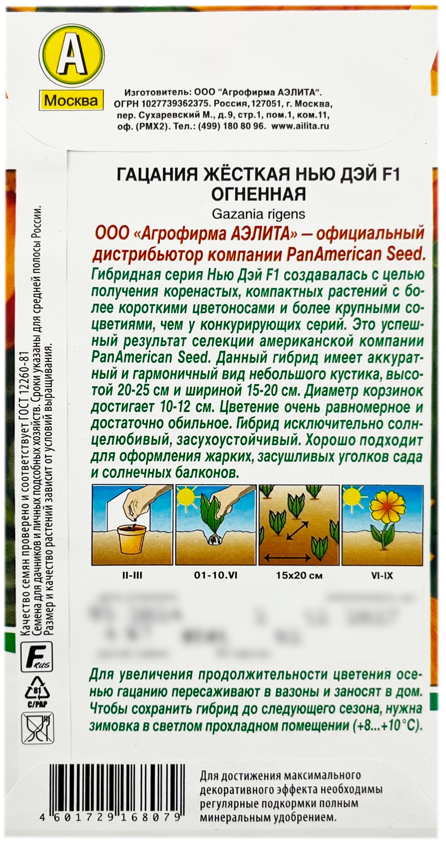 Гацания жёсткая НЬЮ ДЭЙ F1 ОГНЕННАЯ АЭЛИТАГибридная серия Нью Дэй F1 создавалась с целью получения коренастых, компактных растений с более короткими цветоносами и более крупными соцветиями, чем у конкурирующих серий. Это успешный результат селекции американской компании PanAmerican Seed. Данный гибрид имеет аккуратный и гармоничный вид небольшого кустика, высотой 20-25 см и шириной 15-20 см. Диаметр корзинок достигает 10-12 см. Цветение очень равномерное и достаточно обильное. Гибрид исключительно солнцелюбивый, засухоустойчивый. Хорошо подходит для оформления жарких, засушливых уголков сада и солнечных балконов.