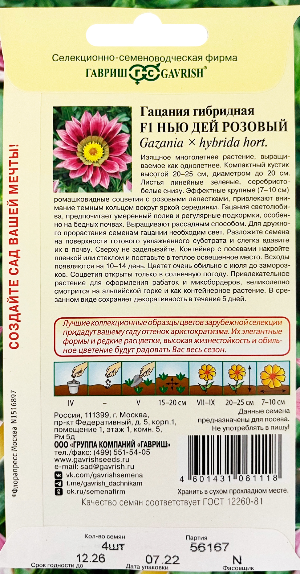 Гацания Нью Дей Розовый F1* 4 шт. серия Элитная клумбаИзящное многолетнее растение, выращиваемое как однолетнее. Компактный кустик высотой 20-25 см, диаметром до 20 см. Листья линейные зеленые, серебристо-белые снизу. Эффектные крупные (7-10 см) ромашковидные соцветия с розовыми лепестками, привлекают внимание темным «кольцом» вокруг яркой серединки. Гацания светолюбива, предпочитает умеренный полив и регулярные подкормки, особенно на бедных почвах. Выращивают рассадным способом. Всходы появляются на 10-14 день. Цветет очень обильно с июля до заморозков. Соцветия открыты только в солнечную погоду. Привлекательное растение для оформления рабаток и миксбордеров, великолепно смотрится на альпийской горке и как контейнерное растение. В срезанном виде сохраняет декоративность в течение 5 дней.