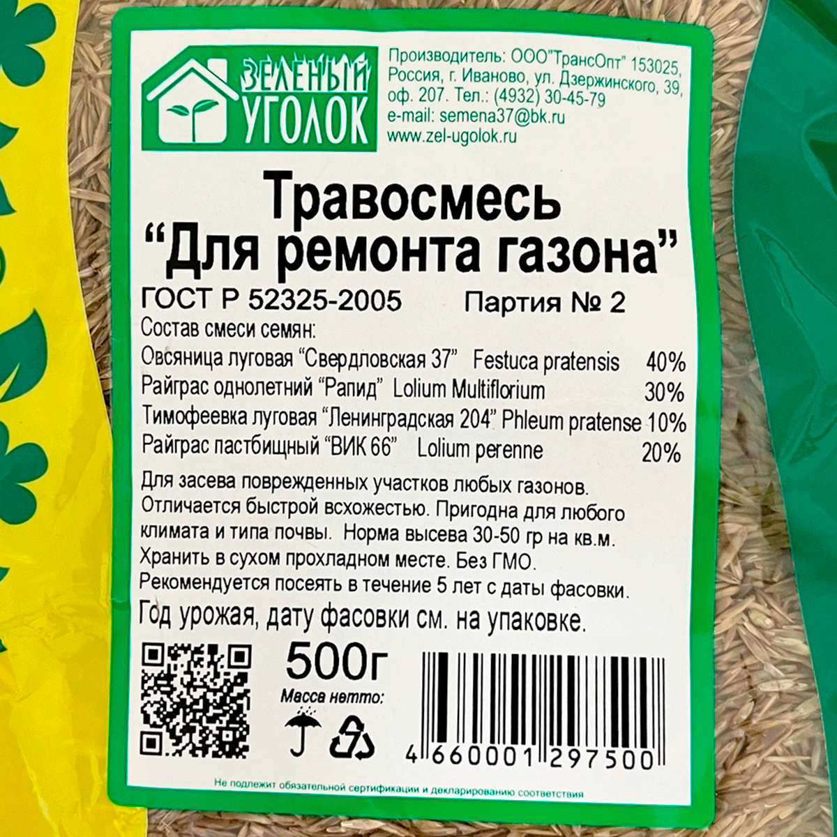 Газон Травосмесь Для ремонта газона 0,5кг Зеленый уголок семена