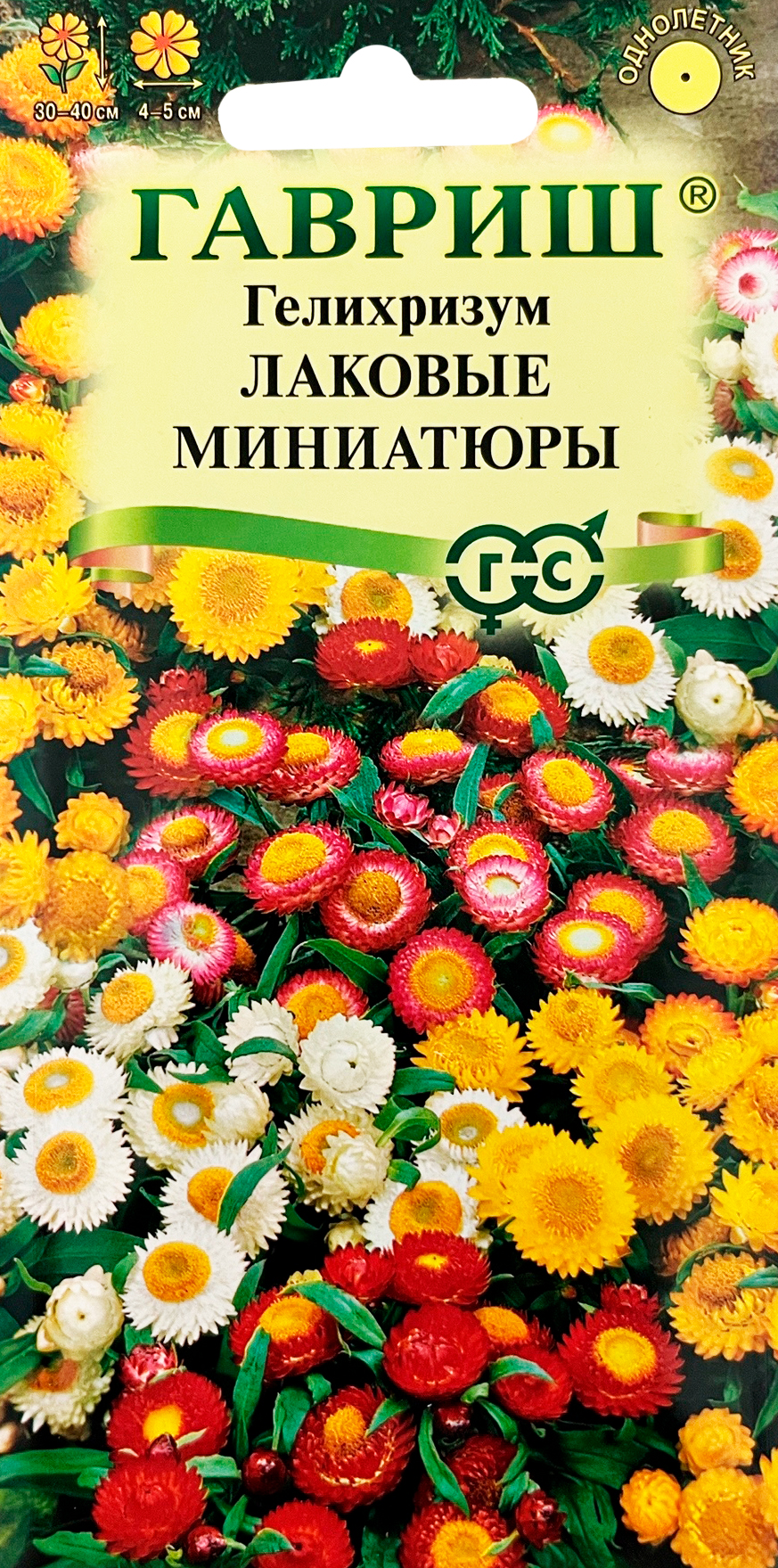 Гелихризум карлик. Лаковые миниатюры* 0,1 гТравянистое однолетнее растение семейства Астровые. Кусты слегка раскидистые, достигают 30-40 см высоты. Цветки собраны в соцветия — корзинки, имеющие очень яркие и многочисленные листочки обертки белой, розовой, желтой, оранжевой или красной окраски разнообразных оттенков. Цветет обильно с июля до заморозков. Предпочитает открытые солнечные места.Размножают семенами, которые высевают в конце марта — начале апреля на рассаду. Всходы появляются через неделю после посева. На постоянное место рассаду высаживают после весенних заморозков, выдерживая расстояние между растениями 15-20 см.Используется в озеленении (клумбах, рабатках), а также на срезку в качестве лучшего сухоцвета.