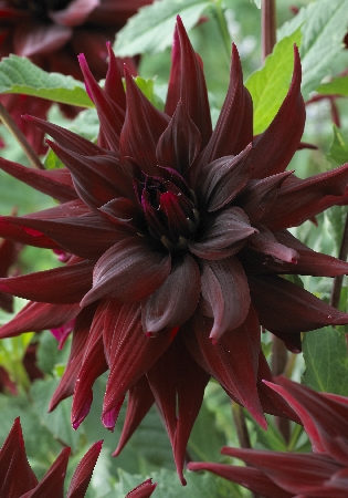 Роскошный георгин из группы Декоративных. Цвет густо-бордовый, в центре соцветие еще темней. Диаметр 20 см. Соцветие с отогнутыми слегка волнистыми лепестками. Для лучшего цветения и получения более крупных цветков необходимо провести удаление боковых бутонов. Трехлетние клубни требуют омоложения способом деления или черенкования.Характеристики