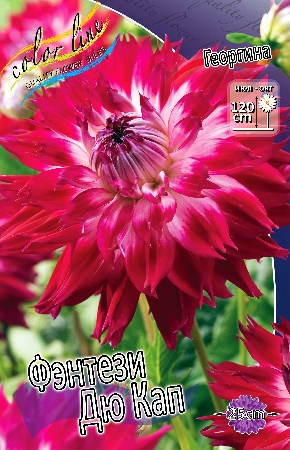 Георгина Фэнтези Дю Кап. Однолетнее декоративное клубневое растение относится к группе бахромчатые. Куст компактный, ветвистый, стебли прочные, полые высотой 120 см. Листья перистые темно-зеленые, многочисленные. Соцветие махровое, малиновое с белым центром, диаметром 25 см. Лепестки с зубчатыми кончиками. Высаживают в конце мая - начале июня, когда минует опасность заморозков. Расстояние между растениями при посадке 30-40 см и 5-7 см над клубнем. Предпочитает солнечные места, защищенные от ветра, плодородные хорошо дренированные почвы. Используется для групповых посадок и на срезку. Цветет в июле-октябре. На зиму клубни выкапывают и хранят в погребах, подвалах при температуре 3-6 градусов и относительной влажности 50-60 %. Георгины размножают делением клубней.Характеристики