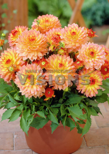 Георгина Гэллери Пабло 6426 GALLERY PABLOкрасный центр, желтый лепесток с лососевыми кончиками, h-35см, Ø-14см