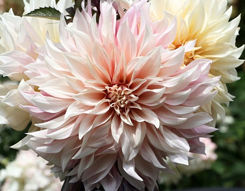 Идеальный сад, по мнению многих садоводов, это постоянно цветущий сад. Добиться непрерывности помогут различные сорта многолетников. Особо красочные и выразительные из них представлены в виде георгин макси Cafe Au Lait (Кафе о Лейт).Цвет георгины Cafe Au Lait не так просто описать, ведь под действием солнечной или пасмурной погоды, а также состава почв, он может видоизменяться в тонах. Белоснежные бутоны переливаются в кремовых, телесных, розовых, лиловых и персиковых тонах. Лепестки, расположенные у центра, трубчатые, небольшие, а нижние ряды более раскрытые и округлые. Цветок очень крупный диаметром до 30 см.