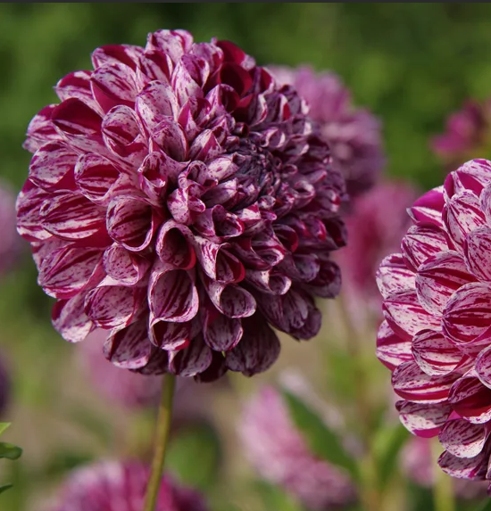 Георгина шаровидная Марбл Болл – махровый, обильно-цветущий сорт, запоминающийся своей пёстрой окраской. Куст высотой до 70 см. Цветки бордового цвета с белым меланжем, диаметр цветка 9 см, лепестки закручены в трубочку плотно прилегают к друг другу, образовывая шар. Цветение обильное и продолжительное, с июля по октябрь.Характеристики