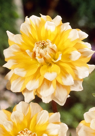 Георгин Seattle (Сиэтл). Привлекательные солнечные крупные махровые цветы желтого окраса с белыми кончиками поднимут настроение. Сорт нетребователен, устойчив к заболеваниям. Легок в выращивании.Характеристики