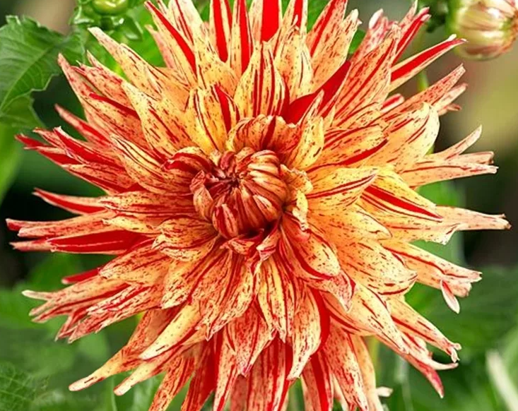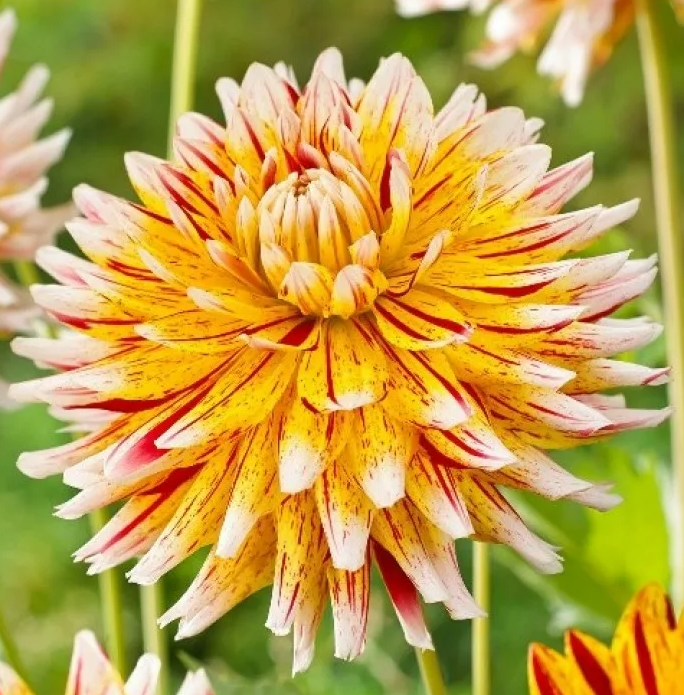 Георгина бахромчатая "Вайнсом" – роскошный, крупноцветковый сорт. Густомахровые цветки, с узкими лепестками (язычковыми цветками) свернутыми у основания и рассеченными на краях – смотрятся, по настоящему, великолепно! Цветки желтого цвета с красными штрихами и белыми кончиками.Характеристики