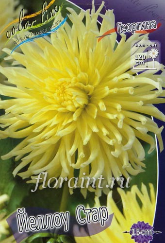 Dahlia Yellow Star - кактусовая. Высота растения 120 см.Диаметр цветка 15 см. По продолжительности цветения георгины - рекордсмены среди цветов открытого грунта. Георгины сравнительно неприхотливы и не требуют особых условий выращивания, не требуют трудоёмкого ухода: их легко вырастить даже начинающему садоводу.Характеристики
