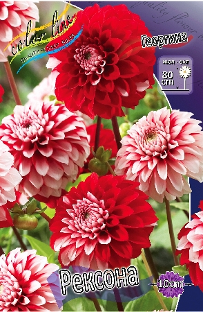 Георгина Рексона. Однолетнее клубневое растение группы шаровидных георгин. Цветок двухцветный: белый с красным центром, диаметром 10-15 см. Плоские язычковые цветки, слегка закрученные в трубочку плотно прилегают к друг другу образовывая шар. Листья перистые, тёмно-зеленые, многочисленные. Куст мощный, пышный, стебли полые высотой 60-70 см. Цветет обильно и продолжительно с июля по сентябрь. Предпочитает солнечные, защищенные от ветра места, плодородные хорошо дренированные почвы. Используется для групповых посадок и на срезку. Устойчива к неблагоприятным условиям, к болезням и вредителям. На зиму клубни выкапывают и хранят в погребах, подвалах при температуре 3-6 градусов и относительной влажности 50-60 %. Георгины размножают делением клубней.Характеристики