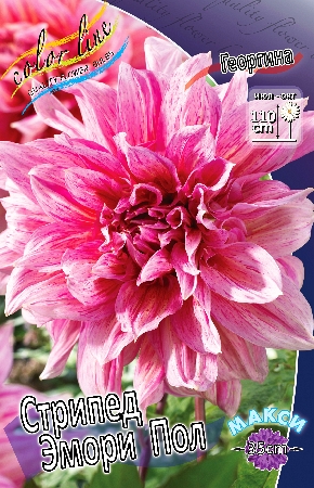 Георгина Стрипед Эмори Пол. Однолетнее клубневое растение группы Декоративных георгин серии Макси. Цветок махровый, розовый с ярко-розовыми частыми и длинными штрихами, диаметром 27 см. Лепестки плоские, широкие, заостренные на концах. Куст мощный, пышный, стебли полые высотой до 110 см. Листья перистые, тёмно-зеленые, многочисленные. Цветет обильно и продолжительно с июля по сентябрь. Предпочитает солнечные, защищенные от ветра места, плодородные хорошо дренированные почвы. Используется для групповых посадок и на срезку. Не требует дополнительных опор. Устойчива к неблагоприятным условиям, к болезням и вредителям. На зиму клубни выкапывают и хранят в погребах, подвалах при температуре 3-6 градусов и относительной влажности 50-60 %. Георгины размножают делением клубней.Характеристики