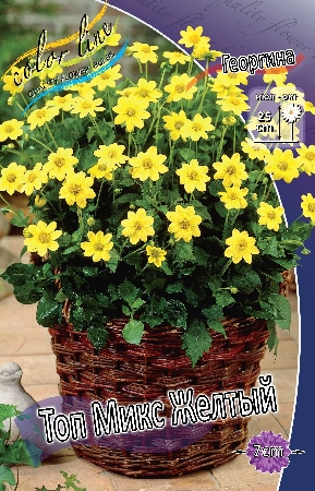 Георгины Топ Микс (Top Мix Dahlia) имеют простую форму цветка: лепестки (краевые язычковые цветки) широкие, расположены в один ряд; цветок плоский, немахровый, в середине соцветия — многочисленные трубчатые цветки желтой окраски. Цветок мелкий, диаметром 5-7 см. Их высота всего 25-30 см. Не требуют дополнительных опор, цветут продолжительно и очень обильно. Георгины Топмикс отлично подходят для переднего края бордюра, а также в качестве контейнерных посадок для украшения террас, балконов и веранд..Посадка: апрель-май (до пасадки хранить корневые шишки в прохладном месте). Георгины растут на хорошо окультуренной, легкой по механическому составу почве. Посадочный материал обычно высаживают в грунт, когда минует угроза заморозков (лучше всего после 2 мая). В ямы размером 30х30х30 см, насыпают заранее подготовленный субстрат и комплексное минеральное удобрение. В зависимости от высоты, расстояние между растениями в ряду — 60–90 см. После посадки растения обильно поливают. Уход за георгинами несложный — обильн