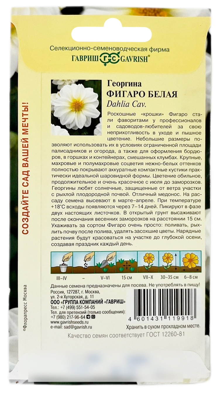 Георгина ФИГАРО БЕЛАЯ ГАВРИШРоскошные «крошки» Фигаро стали фаворитами у профессионалов и садоводов-любителей за свою неприхотливость в уходе и пышное цветение. Небольшие размеры позволяют использовать их в условиях ограниченной площади палисадников и огорода, а также для оформления бордюров, в горшках и контейнерах, смешанных клумбах. Крупные, махровые и полумахровые соцветия нежно-белых оттенков полностью покрывают аккуратные компактные кустики практически идеальной шаровидной формы. Цветение обильное, продолжительное и очень красочное с июля до заморозков. Георгины любят солнечные, защищенные от ветра участки с рыхлой плодородной почвой. Отличный медонос. На рассаду семена высевают в марте-апреле. При температуре +18С всходы появляются через 7-14 дней. Пикируют в фазе двух настоящих листочков. В открытый грунт высаживают после окончания весенних заморозков на расстоянии 15 см. Ухаживать за сортом Фигаро очень просто: поливать, рыхлить почву после полива, удалять засохшие цветы. Нарядные растения будут красоваться на участке до глубокой осени, создавая праздник каждый день.
