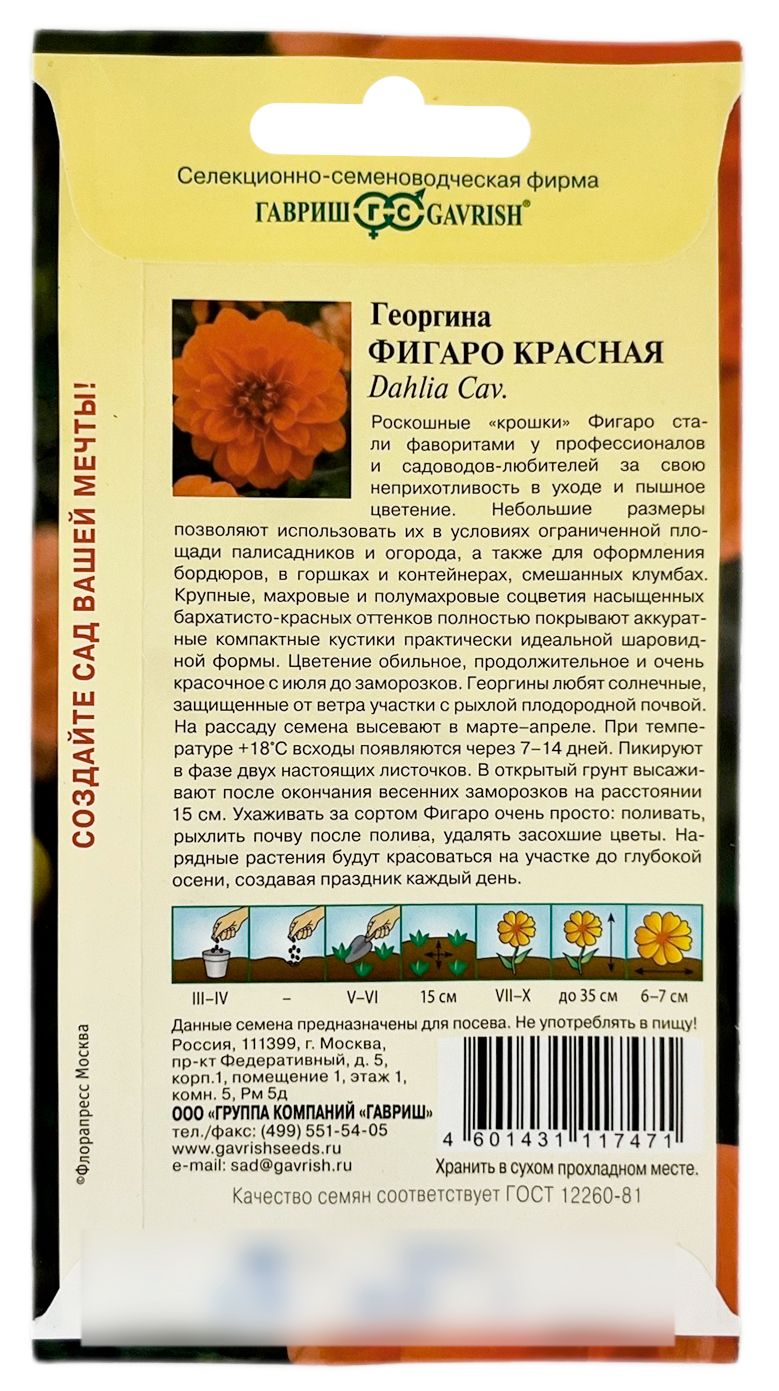 Георгина Фигаро красная ГАВРИШРоскошные «крошки» Фигаро стали фаворитами у профессионалов и садоводов-любителей за свою неприхотливость в уходе и пышное цветение. Небольшие размеры позволяют использовать их в условиях ограниченной площади палисадников и огорода, а также для оформления бордюров, в горшках и контейнерах, смешанных клумбах. Крупные, махровые и полумахровые соцветия насыщенных бархатисто-красных оттенков полностью покрывают аккуратные компактные кустики практически идеальной шаровидной формы. Цветение обильное, продолжительное и очень красочное с июля до заморозков. Георгины любят солнечные, защищенные от ветра участки с рыхлой плодородной почвой. Отличный медонос. На рассаду семена высевают в марте-апреле. При температуре +18оС всходы появляются через 7-14 дней. Пикируют в фазе двух настоящих листочков. В открытый грунт высаживают после окончания весенних заморозков на расстоянии 15 см. Ухаживать за сортом Фигаро очень просто: поливать, рыхлить почву после полива, удалять засохшие цветы. Нарядные растения будут красоваться на участке до глубокой осени, создавая праздник каждый день.