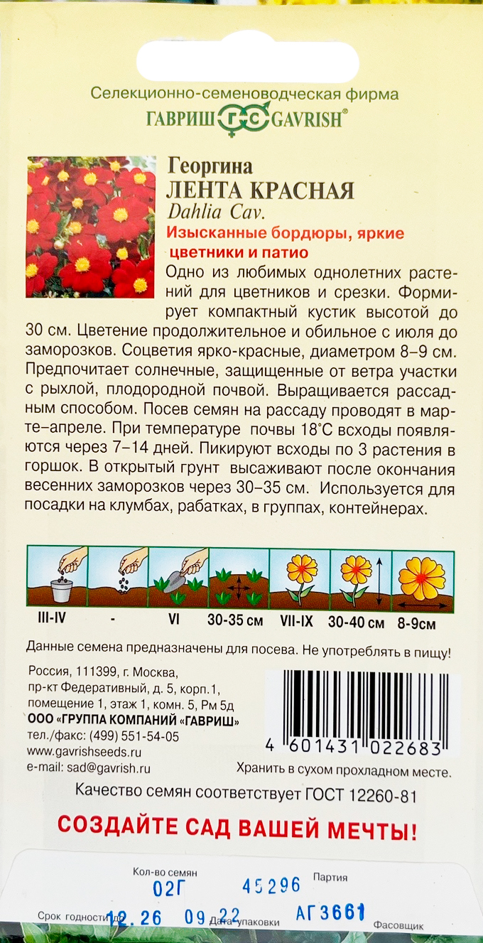 Георгина Лента красная 0,2 г Н9Одно из любимых однолетних растений для цветников и срезки. Формирует компактный кустик высотой до 40-50 см. Образует многочисленные ветвистые стебли высотой 40-50 см. Цветение продолжительное и обильное с июля до заморозков. Соцветия ярко-красные, диаметром 8-9 см. Предпочитает солнечные, защищенные от ветра участки с рыхлой, плодородной почвой. Выращивается рассадным способом. Посев семян на рассаду проводят в марте-апреле. При температуре почвы 18°C всходы появляются через 7-14 дней. Пикирую всходы по 3 растения в горшок. В открытый грунт высаживают после окончания весенних заморозков. Используется для посадки на клумбах, рабатках, в группах, контейнерах.