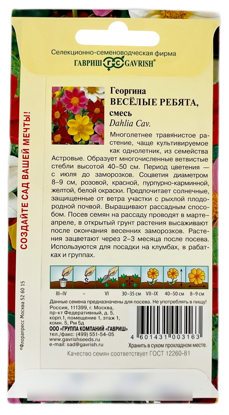 Георгина Веселые ребята ГАВРИШОднолетнее травянистое растение, чаще культивируемое, как однолетник из семейства Астровые. Образует многочисленные ветвистые стебли высотой 40-50 см. Период цветения – с июля до заморозков. Соцветия диаметром 8-9 см, розовой, красной, пурпурно-карминной, желтой, белой окраски. Предпочитает солнечные, защищенные от ветра участки с рыхлой, плодородной почвой. Выращивается рассадным способом. Посев семян на рассаду проводят в марте-апреле, в открытый грунт растения высаживают после окончания весенних заморозков. Растения зацветает через 2-3 месяца после посева. Используется для посадки на клумбах, рабатках, в группах.