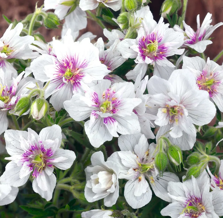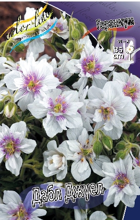 Гераниум Дабл Джуел относится к группе многолетников, высота растения 35 см, цветок: махровый белый со светло-фиолетовым центром. Листья округлые, 5-7-лопастные, с сизоватым оттенком. Время цветения в июне-августе. Схема посадки: 20*20 см. Размножение посевом или делением куста. Месторасположение: солнце или полутень . Почва умеренно плодородная, хорошо дренированная и богатой известью. Вредители и болезни: практически не повреждаются вредителями. Особенно оригинально она будет смотреться на фоне щебня или гальки, в альпинарии или на каменистой горке. Зимостоек без укрытия.Характеристики