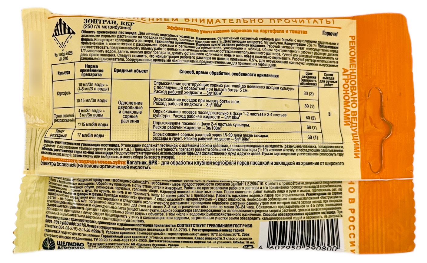 Зонтран, ККР стоп сорнякСистемный гербицид в инновационной формуляции для борьбы с широким спектром двудольных и злаковых сорняков на картофеле, томатах. Обеспечивает чистоту посадок культуры до 60 дней, гибель сорняков – через 10-15 дней. Длительная защита от повторного прорастания сорняков за счет мощного почвенного «экрана». Быстрее других препаратов проникает в сорные растения, подавляя их. Сниженная пестицидная нагрузка на культуру и окружающую среду, полностью разлагается в почве.
