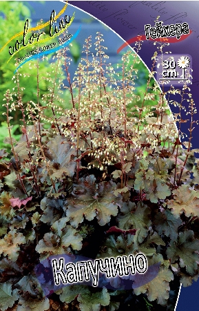 Над глянцевыми темными бронзово-зелеными листьями (темно-бордовыми с изнанки) в конце весны-начале лета появляются воздушные сливочно-кремовые крошечные колокольчики. Кремовые брызги на коричневатом фоне и создают тот вид "кофе со сливками", за который гейхера "Капучино" получила свое название.Характеристики
