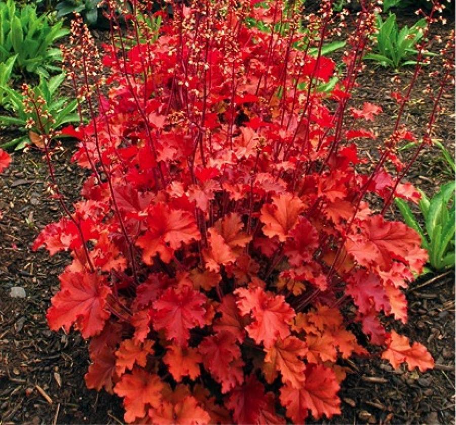 Гейхера декоративна с ранней весны до осени. Цветет продолжительно, 2-3 месяца, с июня по август. Сорт зимостоек и неприхотлив, выдерживает морозы до 40 градусов. Кусты гейхеры красной довольно быстро нарастают и требуют пересадки с делением кустов каждые 5 лет.Характеристики