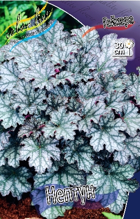 Гейхера Нептун – исключительно изысканный сорт! Ажурные, слегка волнистые по краям, листовые пластинки на длинных черешках расположены почти параллельно земле. Их темно-фиолетовая окраска украшена крупными серебристыми пятнами. Реверс листьев пурпурный. Темно-зеленое жилкование не слишком яркое, хотя создает заметный контрастный эффект.Гейхера Нептун будет эффектно смотреться с голубыми хостами! А также с цветами самых разнообразных холодных оттенков: голубыми, фиолетовыми и лавандовыми, пурпурными. С заведомо ярко-зелёными листьями её лучше не высаживать большими группами. Если только в единичном числе, чтобы «разбавить» общий колорит.