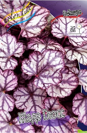 Гейхера Жадэ Глосс. Многолетнее декоративное растение высотой 25 см, диаметр куста 35 см. Листья большие, глянцевые, кожистые, сверху зеленовато-серебристые с фиолетовыми прожилками, снизу красно-фиолетовые. Цветки маленькие, бледно-розовые, на крепких высоких цветоносах. Цветет с июня по август. Предпочитает полутень, чтобы чувствительные листья не получили ожоги. Рекомендуется хорошо дренированная, увлажненная и плодородная почва с обязательным окучиванием один раз в год или через год. Используют в миксбордерах, клумбах, группах и бордюрах. Зимостойкость средняя, на зиму листья не сбрасывает. Гейхеры размножают семенами, делением куста и зелеными черенками.Характеристики