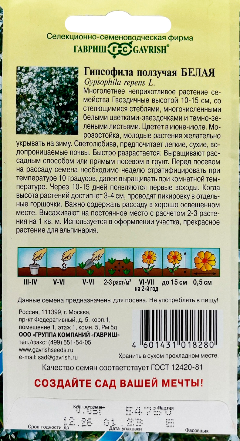 Гипсофила ползучая, Белая* 0,05 гМноголетнее неприхотливое растение семейства Гвоздичные высотой 15 см со стелющимися стеблями с многочисленными мелкими, до 0,5 см белыми цветками и темно-зелеными листьями. Цветет в июне — июле. Морозостойка, но молодые растения желательно укрывать на зиму. Светолюбива, предпочитает легкие, сухие, водопроницаемые почвы, Быстро разрастается, на одном месте может расти до 25 лет. Высевают в апреле-мае в открытый грунт. Высаживают на постоянное место с расчетом 2-3 растения на 1 кв.м. Используется в оформлении участка, прекрасное растение для альпинария.