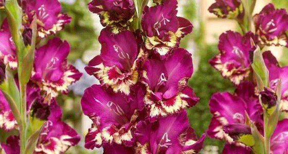 веток гофрированный Верх-лиловый, нижние лепестки с лиловым пятном в центре и зубчатого вида кремовой каймойКрупноцветковые гладиолусы — это высокорослые эффектные растения с крупными, пышными цветками разнообразных расцветок. Они предпочитают солнечное расположение на хорошо дренируемых плодородных почвах. Время посадки — март-начало мая ( по окончании весенних заморозков). в сентябре — октябре клубнелуковицы выкапывают и хранят в прохладном месте до весны.