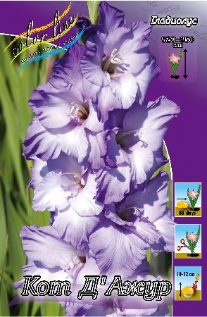 Когда начинается цветение крупно цветкового гладиолуса Cote D’Azure (Коте Д’Азур), то кажется будто волшебное облачко спустилось к Вам в сад показывая Вам необыкновенную красоту природы.Период цветения приходится этого гладиолуса с августа по сентябрь, образуя восхитительные крупные цветы небесно-голубого оттенка с нежно-фиолетовой каймой по краям волнистых лепестков, ближе к центру голубовато-белый оттенок. Форма цветка напоминает бабочку диаметром 15-18 см. Продолжительность цветения 2-4 недели.