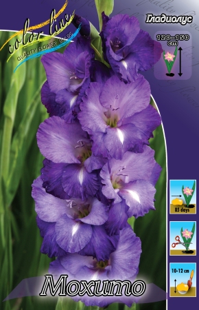 Гладиолус Мохито относится к группе Супер 10/12, высота растения 90-110 см, цветок:фиолетовый с белым мазком. Листья растения узкие и длинные с заостренным концом. Цветение с июля по сентябрь, 10-25 дней.Месторасположение: солнечные, защищенные от ветра участки. Схема посадки 10-15 см. Время посадки - март-начало мая (по окончании весенних заморозков).