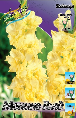 Крупноцветковый гладиолус Morning Gold (Монинг Голд) — шикарный, ярко-желтый сорт. Насыщенный однородный цвет, делает этот цветок ярким акцентом цветника. На ростении одновременно раскрывается 5-8 бутонов, за сезон раскривается до 20- 25 бутонов. Размер цветка до 15 см. Цветение припадает на июль - август. Высадку луковиц гладиолусов проводят в мае, когда станет совсем тепло, температура грунта + 10 С.Характеристики