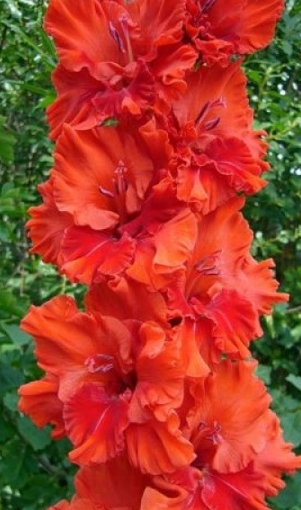 Gladiolus ruff. Fiery LaceОтлично растущий, очень высокий огненно-красный сорт с небольшим розоватым отблеском. Цветки широко открытые с мощными защипами отвернутых наружу внешних лепестков. В соцветии до 25 бутонов, 8-9 одновременно открытых. В букетах и на клумбе создает настроение огненного праздника.