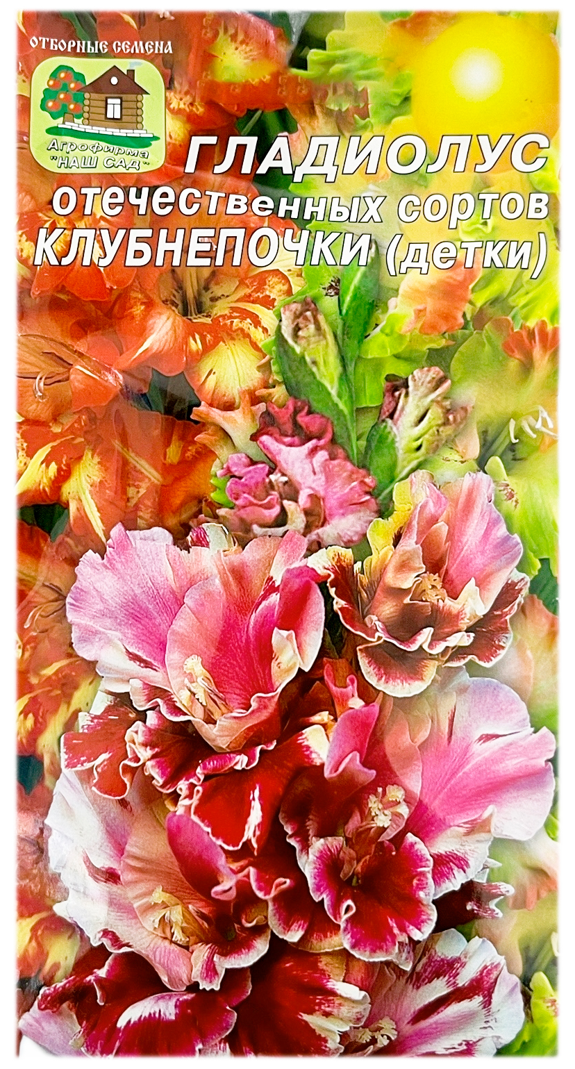 Гладиолус отечественных сортов КЛУБНЕПОЧКИ детки НАШ САДГладиолус гибридный, много летнее растение, которое выращивается весенней посадкой клубнелуковиц и клубнепочек (деток). В условиях открытого грунта Москвы и Московской области цветет с середины июля до октября. После окончания цветения вновь образовавшуюся клубнелуковицу вместе с клубнепочками (детками) выкапывают, сушат и хранят до весны. Преимуществом коллекционных гладиолусов, в том числе сортов отечественных гладиолусов (гладиолусов отечественной селекции) перед голландскими гладиолусами являются высокие декоративные качества коллекционных гладиолусов, обилие изящных, необыкновенных форм и сочетаний окрасок, мощь цветоносов и крупные размеры цветков.