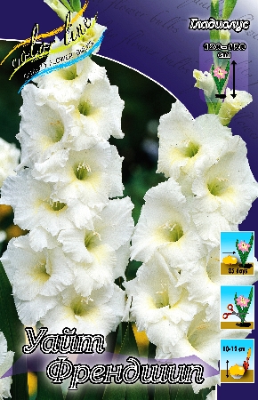 Элегантный крупно цветковый гладиолус White Friendship (Вайт Френдшип) незаменимо будет смотреться в любом уголке Вашего сада, внося средь знойного лета прохладные нотки эффектного цветения. Ознакомиться с описанием и фото гладиолуса White Friendship Вы сможете в нашем каталоге.Период цветения гладиолуса этого сорта приходится на июль-сентябрь, образуя роскошные белоснежные цветы с кремовым отблеском у основания, края лепестков сильно гофрированные. Цветы треугольной формы, при роспуске диаметром 12-14 см. Период цветения гладиолуса 2-3 недели. Высота восхитительного шпажника White Friendship достигает 130 см, из них соцветие 30-40 см, листья мечевидные нежно-зеленого оттенка. В срезке сорт уникально устойчив, используется для срезки и озеленения. Рекомендуется высаживать с интервалом 2 недели, чтоб любоваться восхитительным цветением на протяжении всего сезона. Незаменимо смотрится при комбинированной посадке.