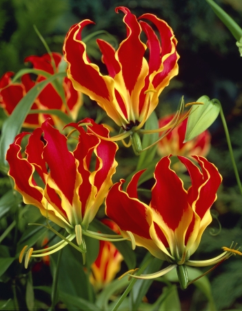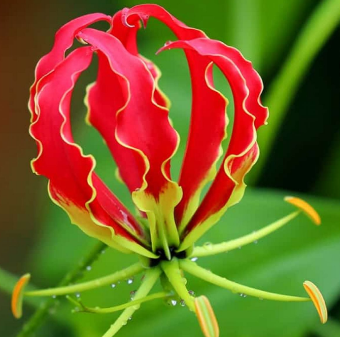 Глориоза Ротшильда. Побеги вьющиеся, сильно разветвленные. Листья ланцетные. Цветоножки длинные, цветы — одиночные. Лепестки огненно-красные, кучерявые, слегка продолговатые. Нижняя сторона лепестков желто-красная. Отличается длительным, устойчивым периодом цветения.Характеристики