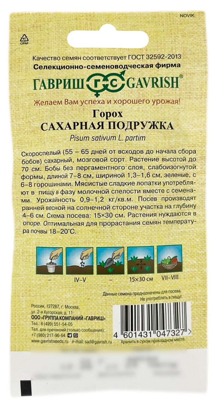 Горох Сахарная подружка ГАВРИШСреднеспелый (65-70 дней от всходов до начала сбора бобов) сахарный сорт. Растение высотой до 130-150 см. Бобы без пергаментного слоя, слабоизогнутой формы, длиной 7-8 см, шириной 1,3-1,6 см, зеленые, с 6-8 горошинами. Мясистые сладкие лопатки употребляют в пищу в фазу молочной спелости вместе с семенами. Урожайность 0,9-1,2 кг/м?. Посев производят ранней весной на солнечной стороне участка на глубину 4-6 см. Схема посева: 15x30 см. Растения нуждаются в опоре.