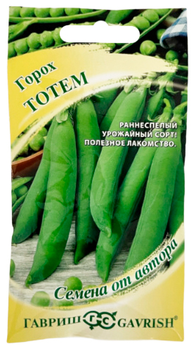 Горох ТОТЕМ ГАВРИШРаннеспелый (42-52 дня от всходов до технической спелости) урожайный сорт, лущильного гороха. Вкусное и полезное лакомство необходимое для здорового, правильного питания. Стебель растения длиной 70-80 см, нуждается в опоре. Цветки кремового цвета. Стручки зеленые, средней длины, слабоизогнутые с 7-8 горошинами. Пергаментный слой имеется. Вкусовые качества горошка отличные. В пищу используют семена в стадии молочной спелости. Рекомендуется для употребления в свежем виде, салатов, консервирования, заморозки. Семена высевают на солнечных участках с хорошо обработанной почвой. Глубина заделки семян 4-6 см. Урожайный сорт, раннее формирование урожая, отличное качество и вкус зеленых бобов.