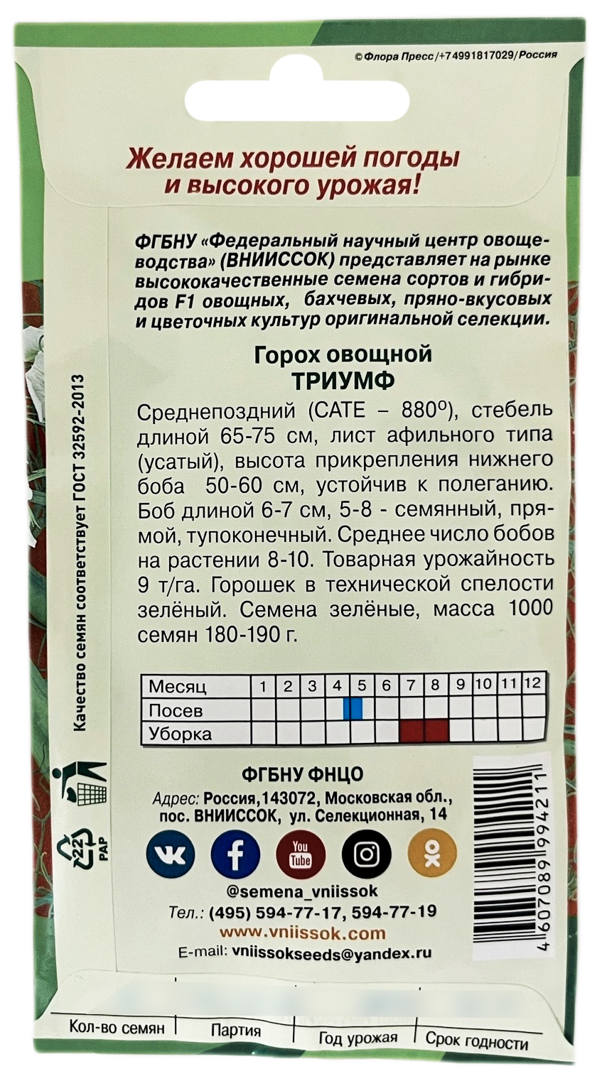 Горох ТриумфСорт среднепоздний, стебель длиной 65-75 см, лист афильного типа (усатый), высота прикрепления нижнего боба 50-60 см, устойчив к полеганию. Бобо длиной 6-7 см, 5-8-семянный, прямой, тупоконечный. Среднее число бобов на растении 8-10. Товарная урожайность 9 т/га. Горошек в технической спелости зеленый. Семена зеленые, масса 1000 семян 180-190 г.