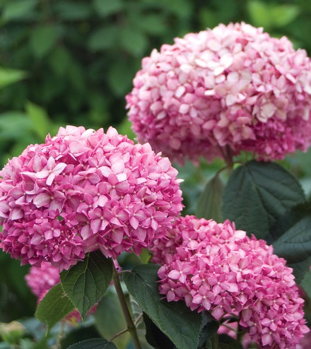 Гортензия древовидная Пинк Аннабель или Инвизибл (Hydrangea arborescens Pink Annabelle or Invincibelle) - выведена из сорта Annebelle. Высота кустарника до 1,5м. Имеет необычную окраску цветков. В начале цветения стерильные цветки, собранные в очень крупные соцветия (до 30см в диаметре), темно-розового цвета, по мере распускания меняют окраску на ярко-розовую. Побеги достаточно крепкие, поэтому во время цветения не сгибаются к земле. Цветет на молодых побегах, что позволяет делать полную обрезку и гарантирует цветение в условиях очень холодных зим. Чем сильнее обрезка, тем крупнее будут соцветия, но их количество при этом уменьшается. Цветет с июня по сентября. Предпочитает богатые, увлажненные, рыхлые, подкисленные почвы.Исключительно эффектное растение в одиночных и групповых посадках. Сочетается с розами, клематисами, лилиями. Хороша для создания опушек в древесно-кустарниковых композициях. Древовидная гортензия и ее формы очень эффектны в живых неформированных изгородях.
