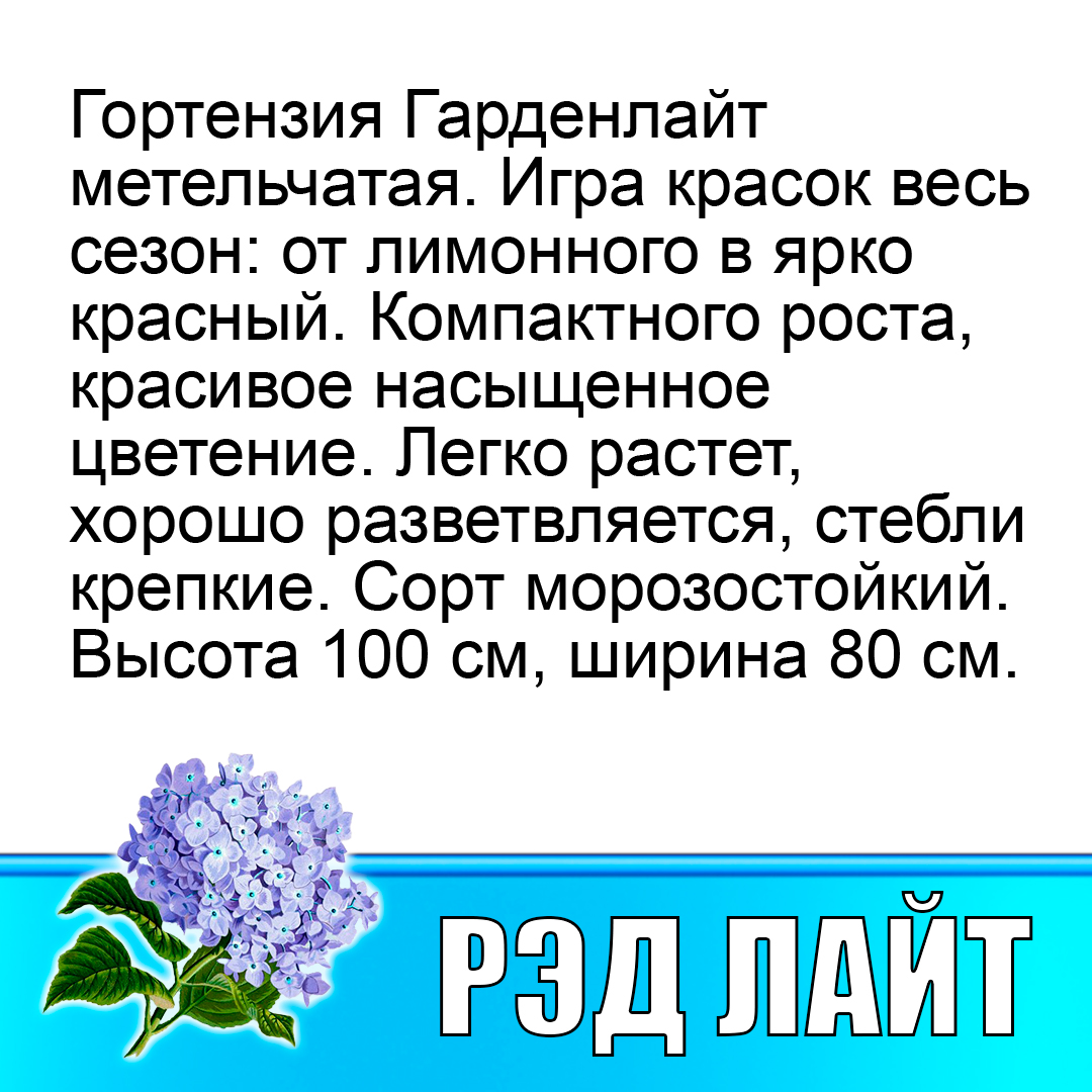 Гортензия метельчатая Гарден лайт Рэд Лайт (Р12)Страна селекции Нидерланды. Игра красок весь сезон просто поражает — от лимонного в ЯРКО КРАСНЫЙ! Компактного роста и красивое насыщенное цветение. Легко растет, хорошо разветвляется, стебли крепкие. Имеет тёмно-зелёные листья, которые хорошо контрастируют с белыми цветами. Предпочитает плодородные, рыхлые, кислые почвы. Не переносит извести. Сорт морозостойкий.