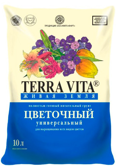 Грунт "Живая земля" 10 л цветочная Фарт - это полностью готовый грунт, который применяется для посадки и пересадки всех цветочных и декоративных культур, рассады и укоренения различных черенков.Грунт "Живая земля" Terra Vita цветочная Фарт изготавливается специально на основе торфа, которые имеют разную степень разложения с добавкой органических субстратов, макро и микроэлементов.