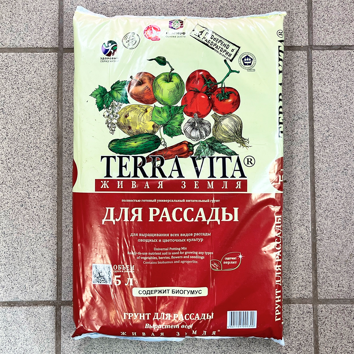 TERRA VITA живая земля ДЛЯ РАССАДЫ 5лПолностью готовый универсальный питательный грунт. Для выращивания всех видов рассады овощных и цветочных культур. Содержит биогумус, перлит.