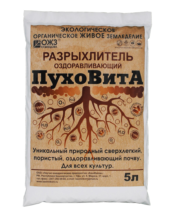 Грунт Пуховита разрыхлитель 5л оздоравливающийРазрыхлитель оздоравливающий ПУХОВИТА – это уникальный природный сверхлегкий, пористый, оздоравливающий разрыхлитель для почвогрунтов. Предназначен для выращивания рассады, цветов, зеленных, овощей, ягод. Это настоящий кладезь природных микроэлементов (Mg, Mn, Ca, K, Fe, Si и др.). Пуховита пропитан полезными фитобактериями и эликсиром плодородия Гуми.