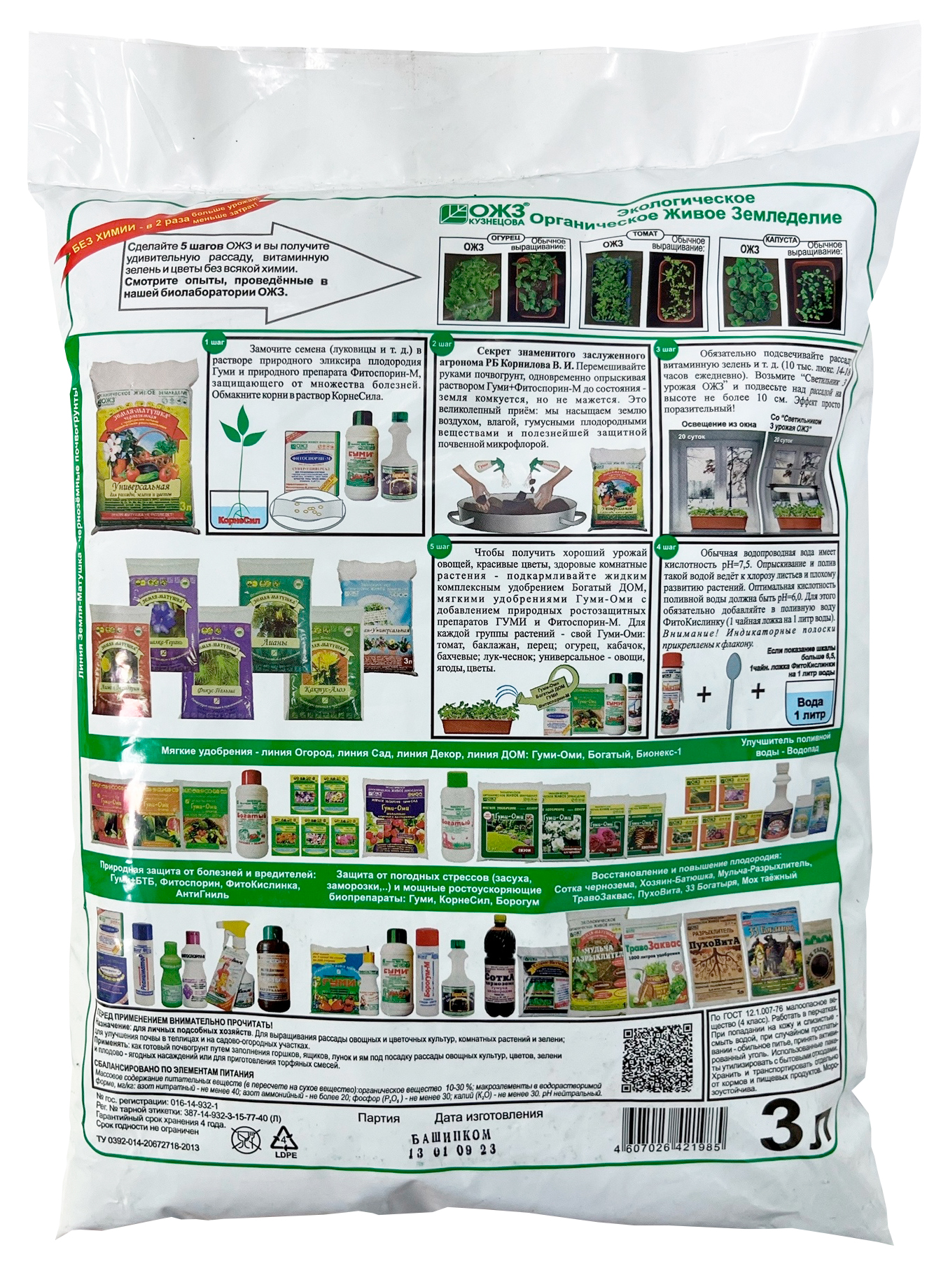 Состав: Полный набор питательных веществ (NPK); микроэлементы (B, Cu, Zn, Mn, Mo, Co и др.); чернозёмный, тучный, гумифицироанный, зрелый торф; ферментированное органическое удобрение; природное гумусное удобрение Хозяин–Батюшка; эликсир плодородия Гуми и полезнейшая дружественная микрофлора; природные легкие разрыхлители. Азот – не менее 40 мг/ кг, фосфор – не менее 30 мг/кг, калий – не менее 30 мг/кг; ферментированное органическое вещество - 30%.