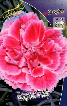Гвоздика Корал Риф. Многолетнее, травянистое, высотой 50 см. Куст раскидистый, стебли восходящие с острыми блестящими, с вечнозелеными, серо-голубыми листьями и лежачими ответвлениями, легко укореняющимися. Соцветие крупное, махровое, коралловое с белой гофрированной окантовкой. Цветки имеют лёгкий, приятный аромат. Цветет с июня по август. Гвоздика Корал Риф неприхотлива, предпочитает солнечные места и хорошо дренированную почву. Посадку производят в марте или в начале апреля, высаживают через 20—30 см друг от друга. Используется для озеленения, в альпинариях, бордюрах. Растение холодоустойчивое, неприхотливое. Многолетнюю гвоздику размножают черенкованием или делением куста.Характеристики