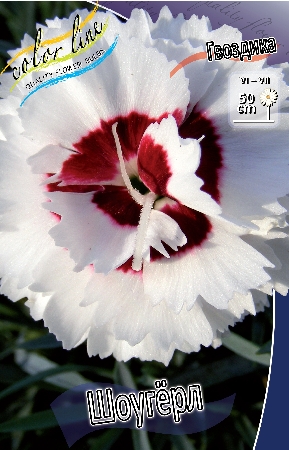 Гвоздика Шоугёрл перистая. Многолетнее, травянистое растение, высотой 50 см. Куст раскидистый, стебли восходящие с острыми блестящими, с вечнозелеными, серо-голубыми листьями и лежачими ответвлениями, легко укореняющимися. Соцветие крупное, махровое, белое с винно-красным пятном. Цветки имеют лёгкий, приятный аромат. Цветет с июня по август. Гвоздика Шоугёрл неприхотлива, предпочитает солнечные места и хорошо дренированную почву. Посадку производят в марте или в начале апреля, высаживают через 20-30 см друг от друга. Используется для озеленения, в альпинариях, бордюрах. Растение холодоустойчивое, неприхотливое. Многолетнюю гвоздику размножают черенкованием или делением куста.Характеристики