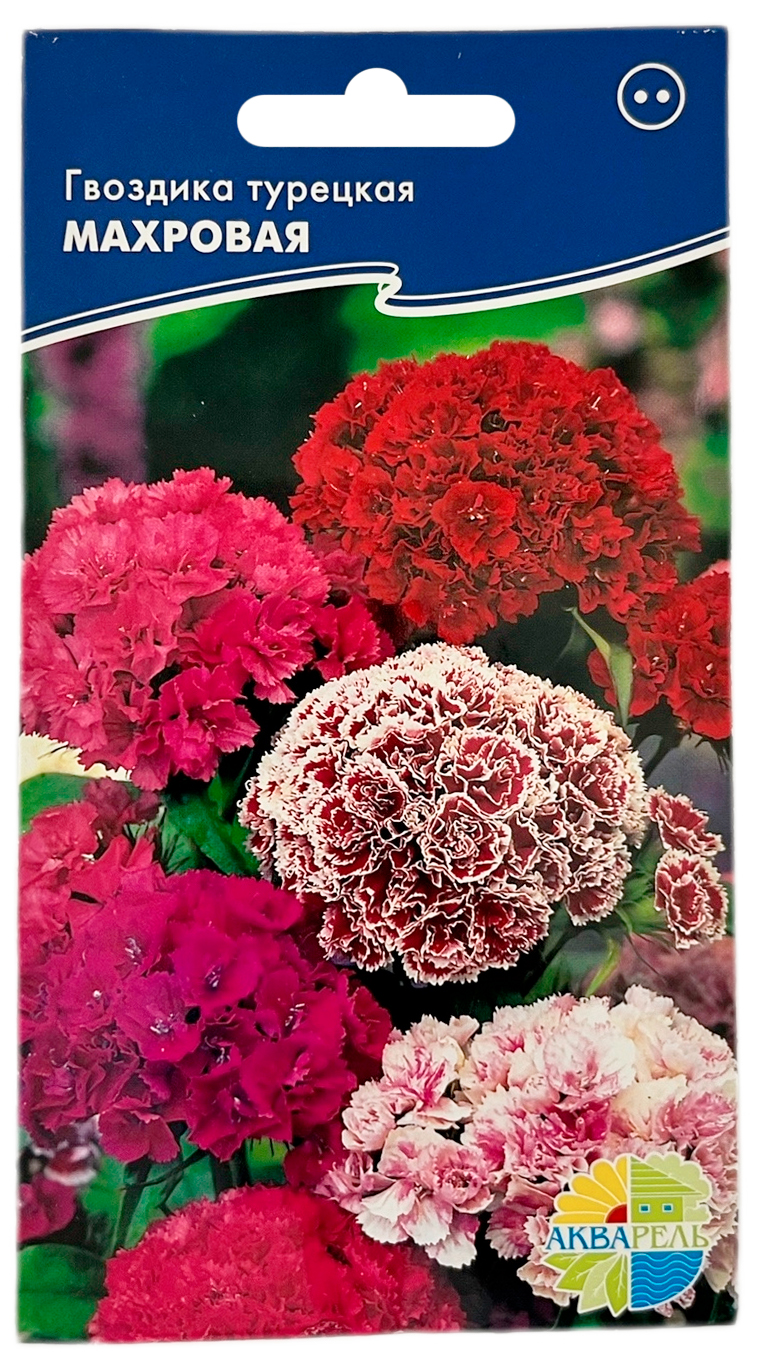 Гвоздика турецкая МАХРОВАЯ АКВАРЕЛЬНеприхотливое, популярное, пышно цветущее, красивое двулетнее растение для клумб, бордюров, рокариев, высотой 50 см. Многочисленные махровые цветки собраны в крупные соцветия щитки диаметром 10-11 см, смесь окрасок. Красивы посадки группами вплотную друг к другу. Срезанные цветы долго сохраняют декоративность.