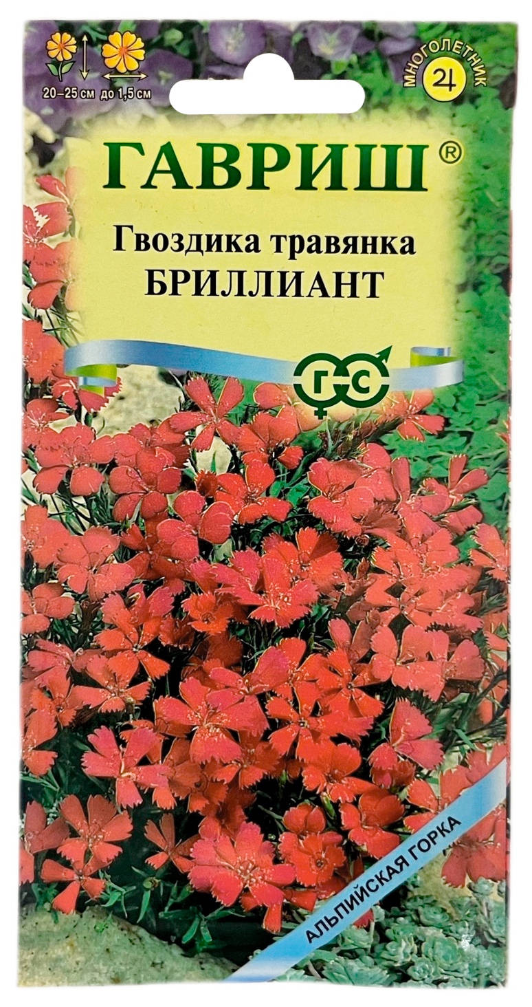 Гвоздика травянка Бриллиант серия Альпийская горка ГАВРИШМноголетние неприхотливое травянистое растение высотой 20-25 см с голыми узловатыми стеблями, часто ветвящимися в верхней части. Обычно все части растения покрыты сизым налетом. Цветки 11-1,5 см в диаметре, карминно-красные. Посев в грунт в мае–июне, оптимальная температура для прорастания 15°С, всходы появляются на 7-14 день. Цветет с июня по август. После цветения желательно срезать цветоносы. Очень эффектно выглядит на переднем плане миксбордера, в рокарии, обособленными группами.