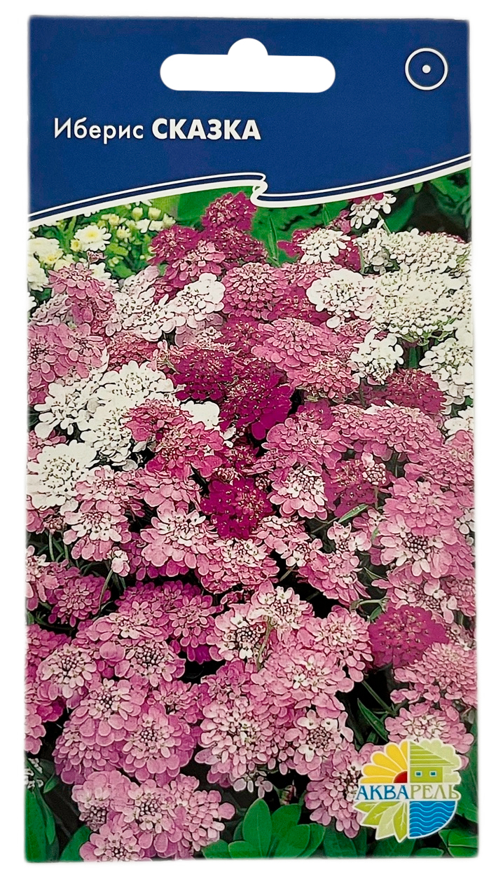 Иберис СКАЗКА АКВАРЕЛЬСильноветвистое растение высотой до 25 см обильно цветет мелкими ароматными цветами, собранными в зонтиковидную кисть, смесь окрасок. Используют для оформления края цветников, бордюров, дорожек, альпийских горок, балконных ящиков, контейнеров. Медонос. Сочетается с колокольчиками, арабисом, виолой.